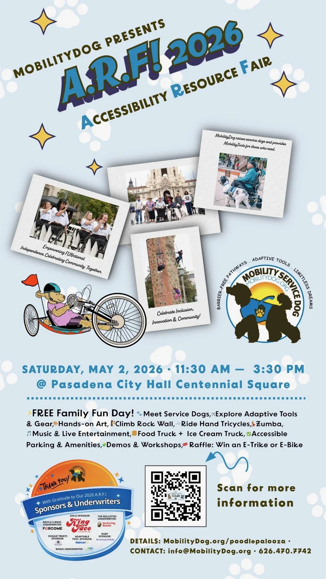 Community, advocacy, and education drive everything we do. Each year on the first Saturday of May, we host a family- and friend-friendly A.R.F! Accessibility Resource Fair at Pasadena City Hall, partnering with disability-community changemakers turning access into action. We also host PAWS & WAG Educational Workshops year-round across California. When you support MobilityDog or join our events, you become part of a growing movement for access, belonging, and opportunity for all.