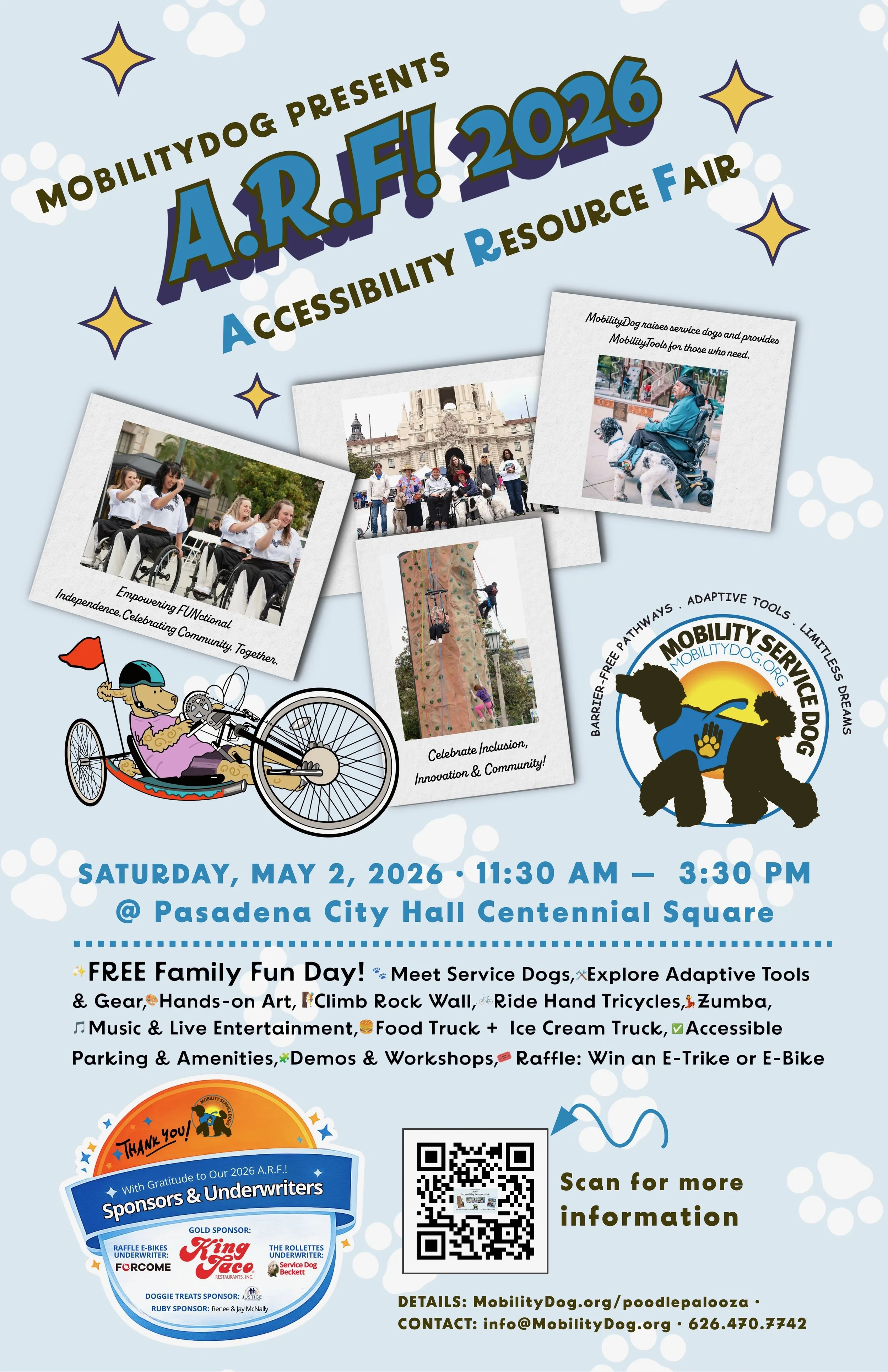 Community, advocacy, and education drive everything we do. Each year on the first Saturday of May, we host a family- and friend-friendly A.R.F! Accessibility Resource Fair at Pasadena City Hall, partnering with disability-community changemakers turning access into action. We also host PAWS & WAG Educational Workshops year-round across California. When you support MobilityDog or join our events, you become part of a growing movement for access, belonging, and opportunity for all.